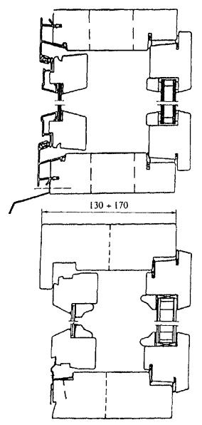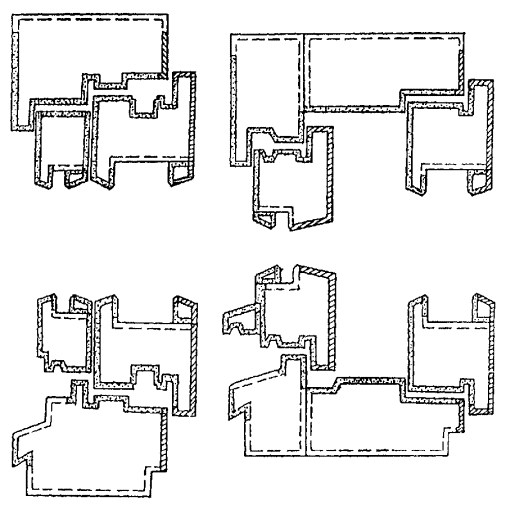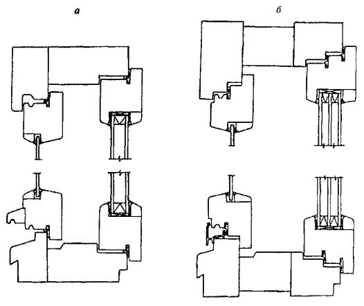 Рисунок 3 - Примеры конструктивных решений импостных и безимпостных притворов оконных блоков спаренной конструкции (вариант распашного открывания)