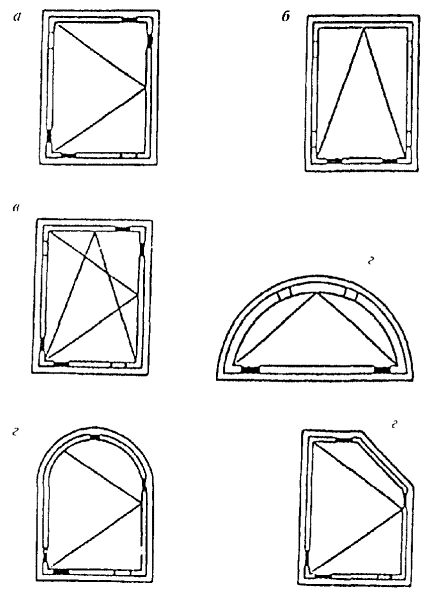 Виды открывания оконных блоков: а - поворотное (распашное); б - откидное, в - поворотно-откидное; г - установка подкладок в фигурных оконных блоках