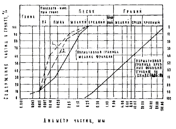 1 - допускаемая граница мелких фракций при возведении насыпей отсыпкой в воду;
