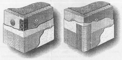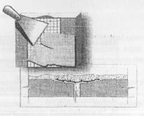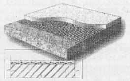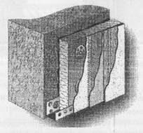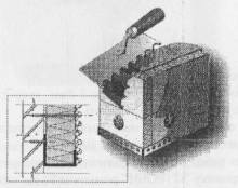 * применяется в виде полос шириной 245 мм, получаемых при продольной разрезке сетки на равные части. 2.1.2. Технология применения.§ Сетки штукатурные для систем наружного утепления фасадов зданий.1. Подготовка поверхности к армированию: Поверхность стены, не имеющая декоративных покрытий, должна быть тщательно промыта водой с помощью агрегатов высокого давления и просушена. При наличии масляных пятен или других видов загрязнения эти места следует очистить или обработать специальными составами для их нейтрализации. Старая штукатурка должна быть проверена простукиванием по всей поверхности, сбита в местах обнаружения пустот и восстановлена. Неровности и перепады более 1 см должны быть устранены, а трещины зашпаклеваны. Окрасочные покрытия должны быть исследованы на совместимость с клеящим составом. При несовместимости этих составов необходимо полностью удалить старые покрытия. Поверхность основания должна быть огрунтована специальным составом, глубоким пропитывающим средством "Интеко-И" (ТУ № 5775-40297330-003-97) или аналогичным составом (средний расход, в зависимости от подложки, 100-150 г/м). Грунтовку поверхностей следует выполнять только после отвердения и просушивания выравнивающих слоев. Допустимые отклонения поверхности основания не более 10 мм. Измерения производятся 2-х метровой металлической рейкой с интервалом не менее 5-ти измерений на каждые 100 м поверхности. Число неровностей (плавного очертания) не более 2-х на длине 2 м. Предельно допустимая влажность основания перед нанесением грунтовочного состава не более 5 %. 2. Устройство базового армирующего слоя: К устройству базового армирующего слоя штукатурки приступают после отвердения клеящего состава, фиксирующего положение утеплителя, и достижения прочного сцепления его с основанием, но не ранее 24 часов после приклейки. Армирующий нижний слой штукатурки выполняется по проекту клеевым составом (рецепт № 51 ТУ № 5745-011-05668056-98 или аналогичный состав) в следующей последовательности; - запаковочную сетку (сетка штукатурная стеклотканевая "СТРОБИ" ССК-5×5 или сетка "СТРОБИ" фасад ССКО-5×5) установить в местах пропуска инженерных коммуникаций, термошвов, оконных и дверных проемов и утопить в раствор с помощью терки, не допуская складок; - разбить поверхность стены на захватки; - рулоны сетки из стекловолокна (сетка штукатурная стеклотканевая "СТРОБИ" ССК-5×5 или сетка "СТРОБИ" фасад ССКО-5×5) перед наклейкой разметить и нарезать под размеры захватки, обеспечивая соблюдение величины их при наклейке (не менее 10 см); - нанести на утеплитель ровный и гладкий слой штукатурного состава (толщиной 3-4 мм) по площади захватки (рис. 1); - сразу после нанесения первого слоя штукатурки наложить на поверхность лист арматурной сетки и утопить его в раствор с помощью терки, не допуская складок (рис. 2); - наложить второй слой штукатурного состава таким же способом, как и первый. При нанесении второго слоя штукатурки следить, чтобы шляпки (головки) дюбелей были скрыты, а также не допускается выход армирующей сетки на поверхность штукатурного слоя. Рис. 1 Рис. 2 Дополнительные меры: - толщина штукатурного слоя - первого 3-5 мм, второго - 2-3 мм, общая толщина защитного слоя должна составлять 5-8 мм; - армирующую сетку следует накладывать вертикально при условии обеспечения перехлеста сеток на ширину 100 мм; - для выполн