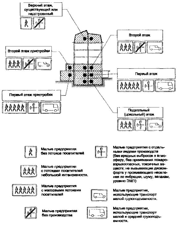 На жилых улицах или внутриквартальных проездах в жилых зданиях рекомендуется предусматривать предприятия повседневного спроса - магазины, молочные кухни, и т.п., а также мини-лицеи. На пешеходных улицах и бульварах во внутренних зонах жилой застройки рекомендуется предусматривать помещения для проведения досуга (в первую очередь, для детей, подростков и пенсионеров), различные кружковые комнаты, художественные мастерские, комнаты временного пребывания детей и прогулочные группы, клубы по интересам, центры физкультурно-оздоровительной работы (тренажерные залы, массажные, залы общей физической подготовки) и т.п. 3.4. Размещение малых предприятий по этажам жилых зданий следует принимать в соответствии с обязательным Приложением 5 МГСН 3.01-01. 3.5. Проект встраивания в жилые здания малых предприятий должен быть согласован в установленном порядке. 4. АРХИТЕКТУРНО-ПЛАНИРОВОЧНЫЕ РЕШЕНИЯ ВСТРАИВАЕМЫХ ПОМЕЩЕНИЙ4.1. Встраиваемые объекты малого предпринимательства могут размещаться: на нижних (первом, втором, цокольном или подвальном) и на верхних (последнем и мансардном) этажах жилого здания (рисунок 4.1). Встраиваемые помещения могут располагаться на одном или двух смежных этажах. При выборе места размещения малого предприятия следует учитывать преимущества и недостатки каждого варианта размещения, приведенные в таблице 2. Наиболее массовым вариантом является встраивание на первом этаже, в силу того, что в первых этажах располагается наибольшая часть имеющегося фонда нежилых помещений в массовой жилой застройке, а по функционально-планировочным требованиям первый этаж подходит для размещения всех возможных типов встроенных малых предприятий. Другие варианты встраивания пригодны для весьма ограниченного набора типов малых предприятий, и соответствующий им фонд нежилых помещений существенно меньше. 4.2. Малые предприятия допускается встраивать в жилые здания с высотой этажа (между перекрытиями в чистоте) не менее 2,8 м при обеспечении санитарно-гигиенических, инженерно-технических и противопожарных требований как к жилой части дома, так и к встраиваемому объекту. 4.3. Параметры и площади нежилых помещений, которые можно использовать для малых предприятий в жилых зданиях массовых серий, приведены в Приложении В. Минимальные площади помещений для предпринимательской деятельности, организуемой на площади основных малых предприятий даны в Приложении Г. Таблица 2. Преимущества и недостатки различных уровней размещения встроенных малых предприятий в структуре жилого здания