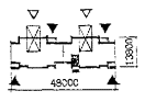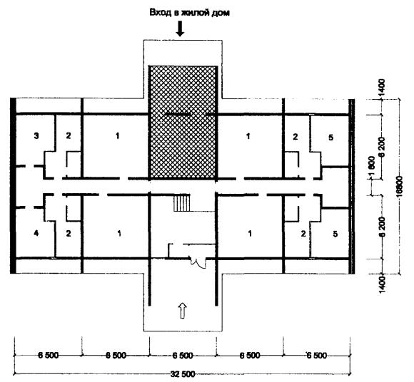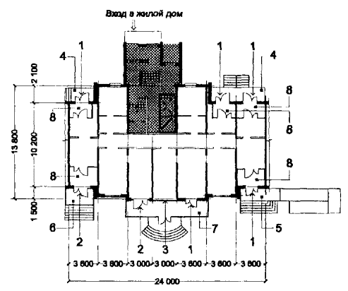 Экспликация помещений: 1 - классное помещение 2 - игральная-спальня 3 - помещение для занятий по иностранному языку 4 - рекреационный зал с тренажерным оборудованием 5 - класс-кабинет 6 - кухня-буфет 7 - комната преподавателей 8 - туалет Общая площадь 400 кв. м. Рис. 4.15. Пример планировочного решения начальной школы на 2 класса на первом этаже жилого дома серии 11-68-01/16-83 (к п. 4.50).