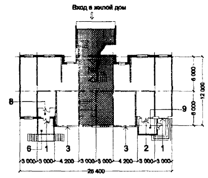 + требуются; - не требуются Таблица 4. Возможные сочетания объектов малого предпринимательства по условиям функциональной совместимости 4.12. С целью лучшей зрительной связи помещений малого предприятия с внешним пространством, а также в рекламных целях может предусматриваться расширение существующих оконных проемов, а также проектирование с учетом функциональных и технологических требований, устройство вместо существующих наружных стен витражных ограждений и витрин. 4.13. Наружные и внутренние двери в помещениях малых предприятий следует предусматривать с учетом возможности провоза тележек и мобильных контейнеров, а также проезда кресел-колясок инвалидов: - ширина двери должна быть не менее 0,9 м; - двери следует устраивать, как правило, без порогов, а при необходимости (например, у наружных дверей) устраивать небольшие пандусы с уклоном не более 1:6. В стесненных условиях пандусы могут быть съемными. 4.14. Помещения встраиваемых малых предприятий должны быть обеспечены отдельными входами, для устройства которых предусматриваются дополнительные дверные проемы и проектируются помещения входной группы: - пристроенные или встроенные тамбуры, - пристроенные крыльца с лестницами и пандусами, - пристроенные террасы (подиумы), охватывающие по фасаду все или большую часть помещений малого предприятия, с лестницами и пандусами. Примеры проектирования входов и помещений входной группы приведены на рисунках 4.2-4.6. 4.15. Встроенные тамбуры могут проектироваться на отметке первого этажа и на пониженном уровне, в том числе «на уровне земли»; при встроенных тамбурах, расположенных на пониженном уровне, внутри здания размещается лестница для подъема на отметку первого этажа. 4.16. Входы встроенных и встроенно-пристроенных малых предприятий следует предусматривать обособлено в жилую часть дома, преимущественно, со стороны магистралей и улиц. 4.17. Загрузку помещений встроенных малых предприятий в жилые здания следует предусматривать согласно требованиям СНиП 2.08.01-89*: - с торцов зданий, не имеющих окон; - из подземных туннелей, - со стороны магистралей или улиц - при наличии специальных загрузочных помещений. При проектировании в существующих жилых зданиях предприятий торговли, питания, бытового обслуживания, а также аптек и детских учреждений по согласованию с ЦГСНЭН допускается загрузка помещений с любой стороны при наличии козырька или навеса над разгрузочными площадками. Указанные загрузочные помещения допускается не предусматривать при общей площади малых предприятий, не превышающей 150 м2. 4.18. При организации участка, прилегающего к встроенному (встроенно-пристроенному) малому предприятию следует исключать пересечения путей движения посетителей и машин к этим предприятиям и путей движения проживающих в жилых домах. 4.19. При проектировании малых предприятий в существующих жилых зданиях размещение автостоянок и количество машино-мест следует определять с учетом наличной территории по согласованию с органами санитарного надзора г. Москвы и органами местного самоуправления. При проектировании (или привязке) новых жилых зданий встраиваемые малые предприятия следует обеспечивать автостоянками с расчетным количеством машино-мест для сотрудников и посетителей с учетом требований МГСН 5.01-94*. 4.20. Встроенные малые детские учреждения 