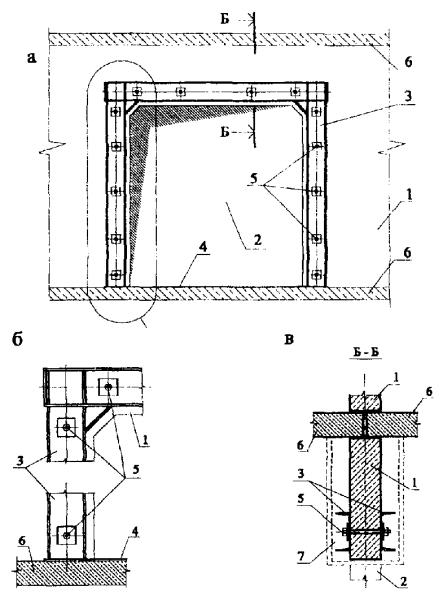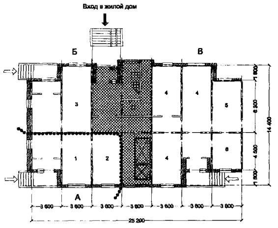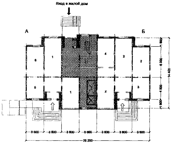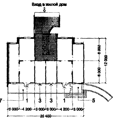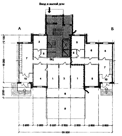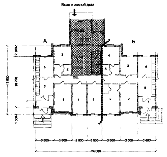 1 Устройство проема для входных дверей путем вырезки подоконной части панели. 2 Устройство проема для входных дверей путем вырезки подоконной части панели и расширения существующего оконного проема. 3 Устройство проема для витража, глухого или с дверью путем полного демонтажа панели. 6 Крыльцо с покрытием 8 Встроенный тамбур 9 Пристроенный тамбур Рис. 4.5. Примеры устройства входов в помещения малых предприятий, встраиваемых в 1-й этаж секции Т1-6Ю жилого блок-дома серии П30-1/12г*(к п. 4.14). 1 Устройство проема для входных дверей путем вырезки подоконной части панели. 3 Устройство проема для витража, глухого или с дверью путем полного демонтажа панели. 5 Крыльцо открытое с пандусом 7 Закрытая терраса (блок внешнего транспорта и внутренних коммуникаций) Рис. 4.6. Примеры устройства входов в помещения малых предприятий, встраиваемых в 1-й этаж торцевой секции Т1-41Ю жилого блок-дома серии П46-2/12В* (к п. 4.14). А - группа продленного дня на 15-20 мест (с помощью в приготовлении уроков); Б - мини-детский сад на 15-20 мест (прогулочные группы). Экспликация помещений: 1 - класс 2 - групповая 3 - комната персонала 4 - кухня 5 - сан. узел 6 - раздевальная 7 - тамбур Общая площадь 330 кв. м. Рис. 4.7. Пример планировочного решения частного детского сада и группы продленного дня в жилой секции П44 (к п. 4.50).