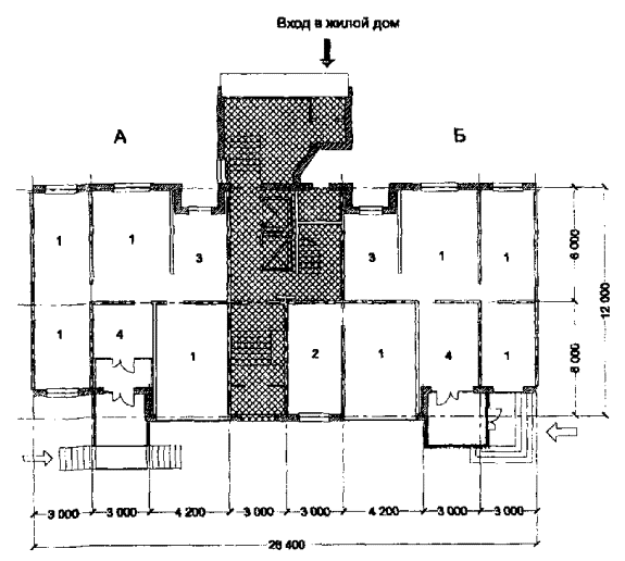 А - мини-маркеты, «удобные магазины» продовольственных товаров; Б - специализированные и универсальные промтоварные магазины. Экспликация помещений: 1 - торговый зал 2 - подсобное помещение 3 - кабинет администрации 4 - холл Общая площадь 250 кв. м. Рис. 4.13. Пример планировочного решения двух комплексов магазинов в жилой секции П 30 (к п. 4.50).