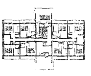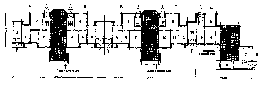 Экспликация помещений: 1 - помещение репетиционных занятий 2 - гардероб 3 - комната преподавателей 4 - офис 5 - комната индивидуальных занятий Общая площадь 400 кв. м. Рис. 4.17. Пример планировочного решения репетиционной студии на первом этаже жилого дома серии 11-68-01/16-83 (к п. 4.50). А - Детский сад на 2 прогулочные группы; Б - Детский сад на 1 разновозрастную группу. Экспликация помещений: Детский сад на 2 прогулочные группы 1 - групповая 2 - раздевальные 3 - кухня 4 - кладовая при кухне 5 - комната персонала Детский сад на 1 разновозрастную группу 6 - групповая 7 - спальня 8 - раздевальная 9 - кухня 10 - комната персонала 11 - медицинская комната 12 - зал для музыкальных и гимнастических занятий 13 - туалеты Общая площадь 400 кв. м. Рис. 4.18. Пример планировочного решения двух детских садов - на 2 прогулочные группы и на 1 разновозрастную группу на первом этаже жилого дома серии 11-68-01/18-83 (к п. 4.50). Экспликация помещений: 1 - фотостудия; 2 - видеопрокат; 3 - ксерокопировочные и переплетные работы; 4 - компьютерное редактирование и графика; 5 - студия звукозаписи, комната для прослушивания; 6 - гардероб, комната персонала; 7 - реставрация и оформление фотографий; 8 - изготовление визиток; 9 - прием заказов на рекламу; 10 - комната ожидания выполнения заказа; 11 - офис. Общая площадь 510 кв. м. Рис. 4.19. Пример планировочного решения мини-бытового комплекса в двух жилых секциях П44 (П44-1/17Н1) (к п. 4.50). Экспликация помещений: А 1 - комната персонала; 2 - торговый зал; 3 - склад; Б 4 - торговый зал; 5 - подсобное помещение; 6 - служебно-бытовое помещение; В 7 - зал на 12 мест; 8 - производственное помещение; 9 - служебно-бытовое помещение; Г 10 - торговый зал; 11 - складское помещение; 12 - служебно-бытовое помещение; Д 13 - зал; 14 - косметический кабинет; 15 - комната посетителей; 16 - служебное помещение; Е 17 - комната приема заказов; 18 - комната персонала. Общая площадь - 1000 кв. м. Рис. 4.20. Пример планировочного решения комплекса предприятий малого бизнеса на первом этаже блок-дома П55-24/12 с двумя рядовыми секциями Р1Н1-552-1БИ и торцевой секцией Т1Н1-554-3А со встроенными нежилыми помещениями. А - аптека; Б - кулинария; В - бар на 24 места; Г - специальный магазин непродовольственных товаров; Д - парикмахерская; Е - служба платных социальных услуг (к п. 4.50). Экспликация помещений: 1 - кабинет математики; 2 - кабинет физики; 3 - кабинет химии; 4 - кабинет русского языка; 5 - кабинет иностранного языка; 6 - кабинет информатики; 7 - лаборантские; 8 - комнаты преподавателей; 9 - комнаты индивидуальных занятий; 10 - кабинет директора; 11 - кабинет завуча, историч. кабинет; 12 - санузлы; 13 - гардероб; 14 - хозкладовая; 15 - буфет. Рис. 4.21. Пример планировочного решения мини-лицея для 9-11 (12) классов на 64 учащихся во встроенно-пристроенных помещениях к двум жилым секциям П44 (П44-1/17Н1) (использование помещений пристроенного промтоварного магазина) (к п. 4.50). Экспликация помещений: 1 - кабинет математики; 2 - кабинет физики; 3 - кабинет химии; 4 - кабинет русского языка; 5 - спортзал; 6 - раздевальная, душ; 7 - кабинет информатики и вычислительной техники; 8 - кабинет иностранных языков; 9 - лаборантские; 10 - комната преподавателей; 11 - туалеты; 12 - помещение для индивидуальной работы; 13 - кабинет директора; 14 - кабинет завуча, исторический кабинет; 15 - буфет; 16 - хоз. кладовая; 17 - гардероб; 18 - кладовая спортинвентаря. Общая площадь 2227 м2. Рис. 4.22. Пример планировочного решения мини-лицея для 9-11 (12) классов на 64 уч