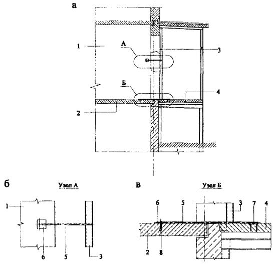 А - пошивочное ателье; Б - специализированный магазин одежды. Экспликация помещений: 1 - пошивочное ателье 2 - торговый зал 3 - комната администрации 4 - прием заказов 5 - сан. узел 6 - вестибюль 7 - тамбур 8 - закрытая терраса Общая площадь 330 кв. м. Рис. 4.9. Пример планировочного решения пошивочного ателье и специализированного магазина одежды в жилой секции П44 (к п. 4.50).