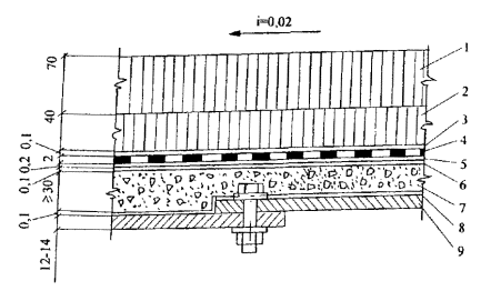 Технология приготовления композиционной мастики состоит из следующих операций: загрузки в смеситель мастик «Поликров-М140 и Л210» и их перемешивания в течение 3-5 мин; порционного добавления цемента и перемешивания до получения однородной массы; порционной загрузки просушенного и просеянного песка с модулем крупности Мкр от 1,5 до 2 и перемешивания до получения однородной массы. Расстояние от поверхности перемешиваемой массы до вала вращения должно быть не менее 5 см. Композиционная мастика должна представлять собой однородную массу вязкотекучей консистенции. Контроль визуальный. Критерий густоты мастики - возможность заполнения (герметизации) труднодоступных для наклеивания рулонного материала мест. Технологическая жизнеспособность мастики - 12 ч. В случае чрезмерного загустевания композиционной мастики к ней добавляют растворитель (толуол, ксилол, Р645, Р647) в количестве от 5 до 15 % от массы мастики (в зависимости от температуры воздуха) и перемешивают в течение 3-5 мин до получения однородной массы вязкотекучей консистенции. При небольшом объеме работ допускается приготовление мастики вручную в металлической или пластмассовой емкости. 6.8. Мастичные материалы упакованы на заводе в герметически закрывающиеся стандартные фляги или металлические бочки. Допускается упаковка мастик в другую тару, обеспечивающую сохранность свойств мастик и выполнение требований безопасности. Объем заполнения тары должен быть не более 90 %. Гарантийный срок хранения мастик - 6 мес. со дня изготовления. По истечении гарантийного срока хранения мастики перед применением должны быть проверены в лаборатории завода-изготовителя на соответствие ТУ и при его установлении могут быть использованы по назначению. 6.9. Материалы гидроизоляционной системы «ПОЛИКРОВ» изготавливаются и поставляются на объекты строительства комплектно. 7. ТЕХНОЛОГИЯ УСТРОЙСТВА РУЛОННО-МАСТИЧНОЙ ГИДРОИЗОЛЯЦИИ «ПОЛИКРОВ» НА МЕТАЛЛИЧЕСКОЙ И ЖЕЛЕЗОБЕТОННОЙ ПЛИТАХ7.1. К гидроизоляционным работам на мостовых сооружениях надлежит приступать после окончания всех строительно-монтажных работ (на изолируемой поверхности), включая устройство деформационных швов, оформление стыковых соединений, монтаж барьерных ограждений, перил, мачт освещения и водоотводных устройств. Подготовка поверхности 7.2. Поверхность металлической или железобетонной плиты перед укладкой гидроизоляции должна быть чистой, сухой и ровной. На изолируемой поверхности не должно быть углублений, неровностей с острогранными кромками, острых выступов, борозд, набрызгов металла от сварки и т.д. Усиление заводских и монтажных сварных швов (выпуклость наплавленного металла с плавными переходами к основному металлу ортотропной плиты) не является браковочным признаком подготовленной поверхности, если сварные соединения соответствуют требованиям стандартов. Ровность поверхности железобетонной плиты проверяют рейкой длиной 3 м. При этом просветы не должны превышать 5 мм вдоль проектного уклона и 10 мм в направлении поперек уклона. Местные острогранные неровности (выступы, борозды и т.п.) высотой более 2 мм на железобетонной плите рекомендуется сглаживать, например посредством нанесения на поверхность полимерцементных растворов на основе латекса СКС-65ГПБ или поливинилацетатной дисперсии ПВАД по рекомендаци