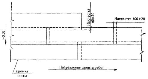 Мастичные материалы при отрицательных температурах имеют повышенную вязкость, в связи с чем расход мастики на 1 м2 будет увеличиваться на 200-300 г. Время высыхания нанесенного мастичного покрытия также будет увеличиваться (в зависимости от температуры воздуха и скорости ветра в зоне производства работ) до 30 мин. Рулонный гидроизоляционный материал «Поликров-Р200» при отрицательных температурах становится более жестким и при укладке требуется более тщательная прикатка его к подготовленной поверхности. Подготовка поверхности основания под гидроизоляцию при отрицательных температурах состоит в очистке ее от снега, льда или инея и просушке до степени влажности 2,5 % широкозахватными газовыми горелками типа ГВПЛ или специальными тепловоздушными агрегатами. В случае непогоды (дождь, снег) для продолжения работ используют легкие складные переносные каркасы, обтянутые полиэтиленовой пленкой, брезентом или другим подобным материалом. 7.8. Устройство гидроизоляции на проезжей части, имеющей двухсторонний поперечный уклон, начинают с обеих кромок к середине с общим потоком работ вдоль моста. Все необходимые материалы подают навстречу потоку гидроизоляционных работ. При одностороннем поперечном уклоне гидроизоляцию наклеивают от нижней кромки к верхней (в направлении, обратном уклону). Рулонный материал раскатывают на поверхности плиты и раскраивают на полотнища (отрезки) длиной по 4-5 м для удобства наклеивания. Рекомендуется, по возможности, предварительное выдерживание полотнищ материала в раскатанном состоянии в течение 1,5-2 ч; высота волны не должна превышать 20 мм. 7.9. Наклейку рулонного материала выполняют в нижеприведенной последовательности. Раскатанное и раскроенное полотнище рулонного материала «Поликров-Р200» складывают пополам (радиус перегиба не менее 10 мм) и наносят вручную капроновыми щетками или валиком мастику «Поликров-М140» на основание плиты и 1/2 части полотнища с суммарным расходом 0,7-1,0 кг/м2 (толщина пленки не менее 0,1 мм). Нанесенную мастику подсушивают «до отлипа»* в течение 3-10 мин в зависимости от температуры воздуха и силы ветра. При солнечной и ветреной погоде время сушки мастики «до отлипа» составляет не более 3-4 мин. Затем часть полотнища с нанесенной мастикой плотно прижимают к основанию и приклеивают, разглаживая вручную или с помощью легких ручных катков, не допуская образования воздушных пузырей под полотном. Далее по той же технологии приклеивают оставшуюся часть полотнища. Наклейку рулонного материала производят с продольной нахлесткой 60 ± 10 мм и поперечной – 100 ± 20 мм (рис. 9). В местах продольной и поперечной нахлесток клеевую мастику также наносят на обе приклеиваемые поверхности «Поликрова-Р200» и соединяют между собой после подсушки «до отлипа». В местах нахлестов рулонного материала «Поликров-Р200» кистью (щеткой) наносят мастику «Поликров-М140» на расстояние не менее 100 мм в обоих направлениях шва. Поверхность уложенной гидроизоляции должна быть ровной, с проектными продольными и поперечными уклонами без обратных уклонов и застоев воды. * При легком прикосновении пальцев к поверхности нанесенной мастики липкость ощущается без следов мастики на пальцах. Рис. 9. Схема наклейки рулонного материала на плиту проезжей части 7.10. Вслед за наклейкой рулонного материала «Поликров-Р200» производят з