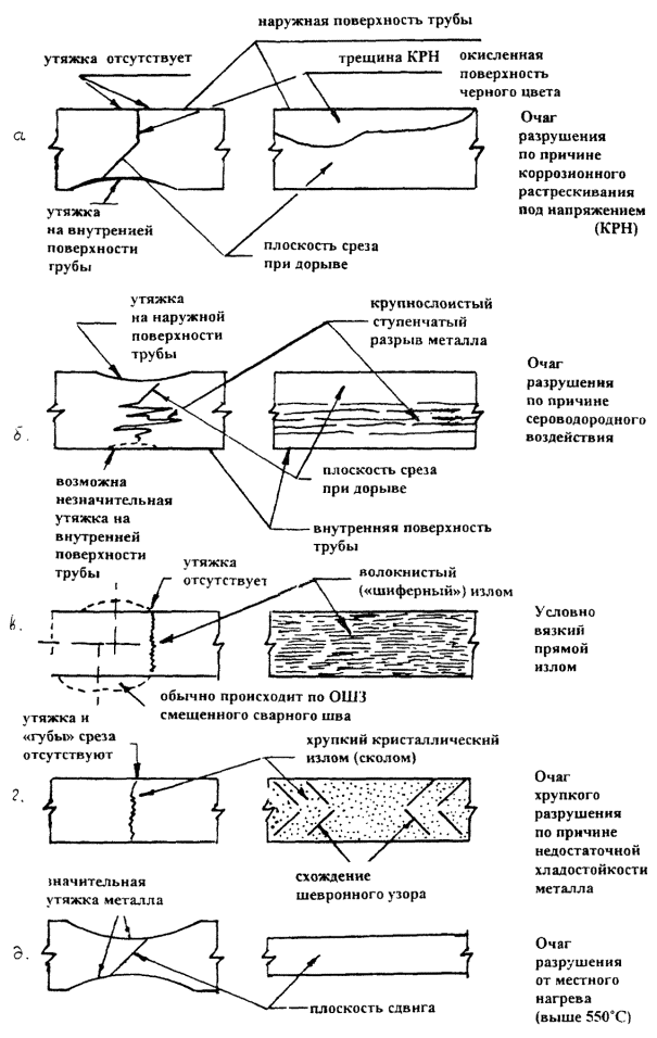 3.3. Чаще всего очаг разрушения включает дефект или группу дефектов металла, уменьшающих толщину стенки. Это могут быть металлургические дефекты типа трещин или плен (в бесшовных трубах), которые развились в процессе эксплуатации, строительные дефекты, дефекты в виде задиров, рисок или царапин, которые, как концентраторы напряжений, способствовали образованию трещин при эксплуатации, и эксплуатационные дефекты, главным образом коррозионного происхождения (коррозионное растрескивание под напряжениями, коррозионное растрескивание от воздействия кислых сред, язвенная и общая коррозия).
