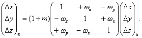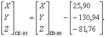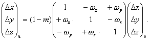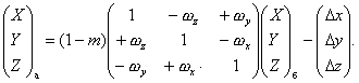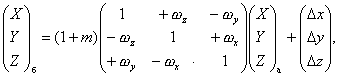 где Dх, Dу, Dz - линейные элементы трансформирования, м; ωx, ωy, ωz - угловые элементы трансформирования, рад; т - дифференциальное различие масштабов систем координат; а, б - системы координат. Обратное преобразование прямоугольных координат выполняют по формуле
