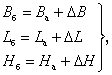 Прямое и обратное перевычисление геодезических координат выполняют по формулам: где B, L, H - геодезические широта и долгота, выраженные в единицах плоского угла, и высота, м; DB, DL, DH - поправки к геодезическим координатам точки; а, б - системы координат. Поправки к геодезическим координатам определяют по следующим формулам: где DB, DL, DH - поправки к геодезическим широте, долготе, …", и поправка к высоте, м; B, L, H - геодезические широта, долгота, рад, и высота, м; Dх, Dу, Dz - линейные элементы трансформирования системы координат а относительно системы координат б, м; ωx ωy ωz - угловые элементы трансформирования системы координат а относительно системы координат б, …"; т - дифференциальное различие масштабов систем координат б и а; а, б - системы координат Dа = аб - aа; De2 = eб2 - еа2;