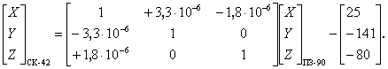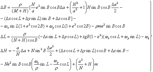 М - радиус кривизны меридианного сечения (М = а(1 - е2)(1 - е2 sin2В)-3/2); N - радиус кривизны первого вертикала (N = а(1 - е2 sin2B)-1/2); аб, аа - большие полуоси эллипсоидов в системах координат б и а соответственно; еб2, еа2 - квадраты эксцентриситетов эллипсоидов в системах координат б и а соответственно; ρ - число угловых секунд в 1 радиане (ρ = 206264,8062"). При преобразовании из системы а в систему б используют значения геодезических координат в системе а, а при обратном переходе - в системе б. Формулы (23) обеспечивают вычисление поправок к геодезическим координатам с погрешностью, не превышающей 0,3 м (в линейной мере), а для достижения погрешности не более 0,001 м выполняют вторую итерацию, то есть учитывают значения поправок к геодезическим координатам по формулам (22) и повторно выполняют вычисления по формулам (23). При этом
