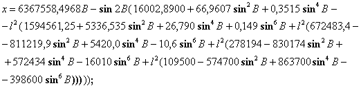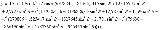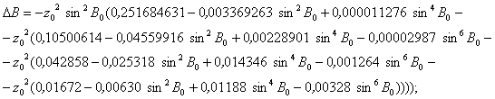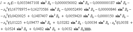 где х, у - плоские прямоугольные координаты определяемой точки в проекции Гаусса - Крюгера, м; В - геодезическая широта определяемой точки, рад; l - расстояние от определяемой точки до осевого меридиана зоны, рад, вычисляемое по формуле l = {L - [3 + 6(n - 1)]}/57,29577951; (27) L - геодезическая долгота определяемой точки, …; n - номер шестиградусной зоны в проекции Гаусса - Крюгера, вычисляемый по формуле n = E[(6 + L)/6], (28) E[…] - целая часть выражения, заключенного в квадратные скобки. Преобразование прямоугольных координат проекции Гаусса - Крюгера на эллипсоиде Красовского в геодезические координаты осуществляют по формулам: В = В0 + DB; (29) L = 6(n - 0,5)/57,29577951 + l, (30) где В, L - геодезические широта и долгота определяемой точки, рад; B0 - геодезическая широта точки, абцисса которой равна абциссе х определяемой точки, а ордината равна нулю, рад; п - целая часть числа, вычисляемого по формуле n = E[y 106], (31) E[…] - целая часть выражения, стоящего в квадратных скобках; у - ордината определяемой точки в проекции Гаусса - Крюгера, м; b - вспомогательная величина, вычисляемая по формуле b = х/6367558,4968; (32) х - абцисса определяемой точки, в проекции Гаусса - Крюгера, м; z0 - вспомогательная величина, вычисляемая по формуле z0 = (y - (10n + 5)105)/6378245 cosB0. (33) Далее вычисления геодезических координат определяемой точки выполняют по следующим формулам: В0 = (b + sin2b (0,00252588685 - 0,00001491860 sin2b + 0,00000011904 sin4b); (34)