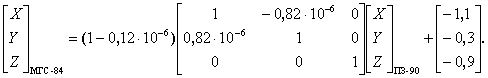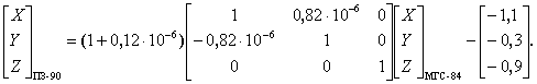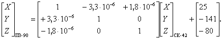 Если модуль разности d равен или больше установленного значения, то s1 = s2 (19) и вычисления повторяют, начиная с формулы (14). При преобразованиях координат в качестве допуска прекращения итеративного процесса принимают значение 0,0001". В этом случае погрешность вычисления геодезической высоты не превышает 0,003 м. 4.2 Преобразование координат Пользователям КНС ГЛОНАСС и ГСП необходимо выполнять преобразования координат из ПЗ в систему МГС и обратно, а также из ПЗ и МГС в референцную систему координат Российской Федерации. Указанные преобразования координат выполняют, используя семь элементов трансформирования, точность которых определяет точность преобразований. Элементы трансформирования между системами координат ПЗ и МГС приведены в приложении Б. Преобразование координат из системы МГС в координаты референцной системы Российской Федерации осуществляют последовательным преобразованием координат сначала в систему ПЗ, а затем - в координаты референцной системы. Преобразование пространственных прямоугольных координат выполняют по формуле