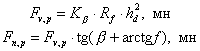где x - коэффициент вариации прочности образцов льда на одноосное сжатие (Rc) при отсутствии натурных данных допускается принимать x = 0,2; K2 - коэффициент «взаимовлияния» равный: при b/l ³ 1 K2 = Kb(n)/Kb; при 0,1 < b/l < 1 К2 определяется линейной интерполяцией между значениями Kb(n)/ Kb и 1; при b/l £ 0,1 К2 = 1, где Kb(n) и Kb - коэффициенты смятия для системы опор и для единичной опоры соответственно, значения которых следует определять из табл. 4, при этом: Kb(n) определяется при соотношениях bf/hd = nf×b/hd; Kb определяется при соотношениях b/hd, где b, hd - обозначения те же, что и в п. 2.1.6; l - расстояние по фронту между осями опор, м; bf - общая ширина опорных колонн по фронту сооружения, bf = nf×b, где nf - число колонн по фронту сооружения. 2.1.8. Вертикальную Fv.p и горизонтальную Fh.p составляющие нагрузки от подвижки ледяного поля на отдельно стоящую опору конической формы при отсутствии смерзания со льдом следует определять соответственно по формулам: