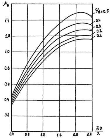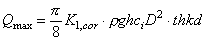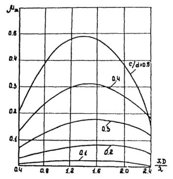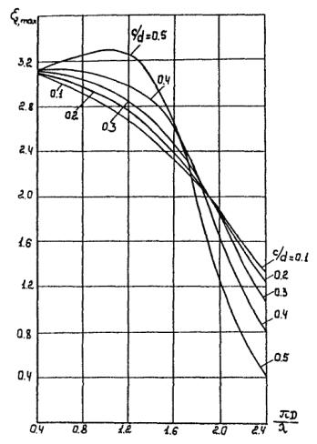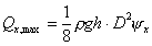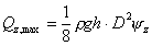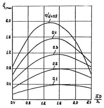 где: D - диаметр преграды, м; r - плотность воды, т/м3; g - ускорение силы тяжести; h - высота волны, м; ci - инерционный коэффициент, зависящий от параметра k = 2p/l - волновое число, рад/м; l - длина волны, м; d - глубина воды, м. 2.3.3. Максимальную силу от воздействия волн Qmax, кН, на вертикальную цилиндрическую преграду следует определять по формуле: