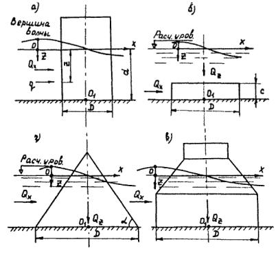 Примечание: Площадь приложения локальной ледовой нагрузки определяется зоной действия ровного ледяного поля при заданных поперечных размерах опоры с учетом колебаний уровня воды. 2.2. Нагрузки и воздействия ветра2.2.1. Нагрузки от ветра на конструкции и их элементы следует определять в соответствии со СНиП 2.01.07-85 и ВСН 51.3-85. 2.2.2. При наличии ледового покрова, коэффициент изменения скоростного напора по высоте должен соответствовать коэффициенту изменения скоростного напора открытой местности по СНиП 2.01.07-85. 2.2.3. Расчетные площади элементов следует определять с учетом их возможного обледенения, определяемого по «Рекомендациям по расчету массы льда при морском обледенении надводных объектов», ААНИИ, Ленинград, 1984 г. 2.3. Нагрузки и воздействия от волнНагрузки и воздействия от волн на вертикальные цилиндрические преграды 2.3.1. Нагрузки и воздействия от волн на вертикальные цилиндрические преграды при относительном диаметре преграды D/l £ 0,4 и относительной глубине d/l > 0,175 следует определять по СНиП 2.06.04-82*. При D/l = 0,2 ¸ 1,0 и d/l £ 0,175, а также D/l > 0,4 и d/l > 0,175 расчеты следует выполнять по рекомендациям настоящего раздела. 2.3.2. Максимальную линейную нагрузку от волн gmax, кН/м, на вертикальную цилиндрическую преграду на глубине z ³ 0, м от расчетного уровня воды (черт. 1а) следует определять по формуле: