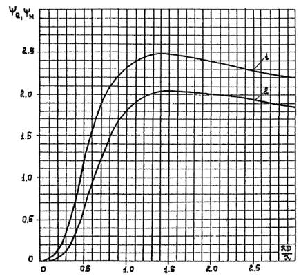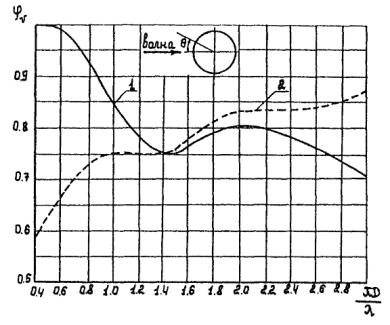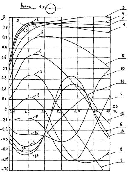 0) на расстоянии l от контура преграды, определяемом следующим образом: при Черт. 6. Графики значений коэффициента распределения давления по периметру цилиндрической преграды c(ka, q): 1 - q = 0°; 2 - q = 15°; 3 - q = 30°; 4 - q = 45°; 5 - q = 60°; 6 - q = 75°; 7 - q = 90°; 8 - q = 105°; 9 - q = 125°; 10 - q = 135°; 11 - q = 150°; 12 - q = 165°; 13 - q = 180° Черт. 7. Графики значений коэффициента максимальной донной скорости jV: 1 - у контура цилиндрической преграды; 2 - в окрестности преграды Нагрузки от волн на затопленный цилиндр 2.3.11. Расчет нагрузок от волны на затопленный цилиндр диаметром D (черт. 1б) при d - c ³ 2h (исходные волны не разрушаются над кровлей затопленного цилиндра) следует выполнять по п.п. 2.3.12 - 2.3.14, где с - возвышение кровли цилиндра над дном. При d - c < 2 h допускается выполнять расчеты по п.п. 2.3.12 - 2.3.14 с обязательным уточнением результатами проведенных экспериментальных исследований. 2.3.12. Максимальную горизонтальную силу Qx,max, кН на затопленный цилиндр следует определять по формуле