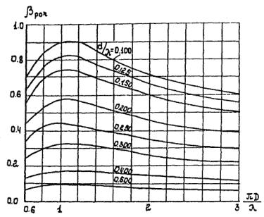 График Черт. 5. Графики значений коэффициента bроr дополнительного опрокидывающего момента от воздействия волн на дно цилиндра с учетом проницаемости основания 2.3.9. Максимальное возвышение гребня волны у контура вертикальной круглоцилиндрической преграды, hc.max, м, над расчетным уровнем воды следует определять по формуле hc.max = xmax×hc,i, (18) где hc,i - превышение вершины волны, с высотой обеспеченностью 0,1 % над расчетным уровнем воды, определяемое по СНиП 2.06.04-82*; xmax - коэффициент максимального возвышения волны у опоры, определяемый по табл. 6. Таблица 6