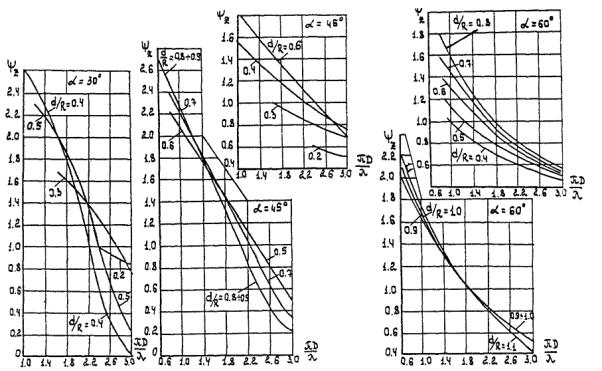 где N - произвольное число (10 ¸ 20) равновеликих интервалов Dz, м, по высоте преграды от расчетного уровня воды (z = 0) до дна (z = d); zj - глубина центра j-го интервала от расчетного уровня воды, м; D(zj) - диаметр сечения преграды на глубине zj, м; ci(zj) - инерционный коэффициент, соответствующий параметру Черт. 9. Графики значений коэффициента ez,max максимальной вертикальной силы от воздействия волн на затопленный цилиндр Черт. 10. Графики значений коэффициента mx опрокидывающего момента от горизонтальной волновой нагрузки на затопленный цилиндр Черт. 11. Графики значений коэффициента mz опрокидывающего момента от вертикальной волновой нагрузки на затопленный цилиндр На стадии рабочей документации расчеты горизонтальной и вертикальной сил, а также общего опрокидывающего момента от воздействия волн на цилиндрическую преграду с конической вставкой следует производить на основе результатов лабораторных исследований и теоретического решения задачи дифракции волн у преграды. Нагрузки от волн на коническую преграду 2.3.16. Расчет нагрузок от волн на конические преграды по п.п. 2.3.17 ¸ 2.3.19 производится при следующих условиях: 30° £ a £ 60°; 2.3.17. Максимальную горизонтальную силу от воздействия волн Qx,max, кН на коническую преграду следует определять по формуле
