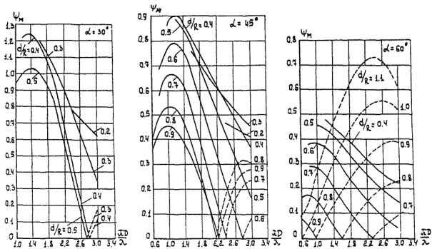 где bроr - коэффициент дополнительного опрокидывающего момента от воздействия волн на дно преграды с учетом проницаемости основания, определяемый по черт. 5. 2.3.8. Избыточное над гидростатическим волновое давление Р, кПа, в произвольной точке смоченной поверхности вертикальной цилиндрической преграды в момент времени, соответствующий наступлению максимумов нагрузок qmax и Qmax, следует определять по формуле