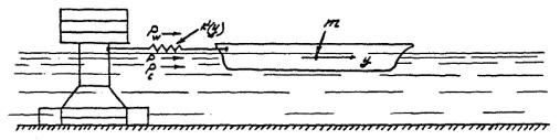 При наличии волнения с высотой до 1,5 м, прижимного ветра со скоростью до 15 м/с или течения в том же направлении со скоростью до 0,5 м/с нормальная составляющая скорости подхода судна должна быть увеличена в 1,41 раза, при одновременном учете двух факторов - в 1,73 раза, при учете трех факторов - в 2 раза. Черт. 16. Схема расчета для одноточечной швартовки 2.4.4. Поперечную горизонтальную силу Fq, кН, от навала судна при подходе к сооружению в условиях волнения, ветра и течения необходимо определять для значения энергии Eq, кДж, вычисленного с учетом п. 2.4.3 и в соответствии с требованиями СНиП 2.06.04-82*. 2.4.5. Динамические нагрузки от судна, закрепленного к причалу в одной точке (одноточечная схема швартовки, черт. 16) с носовым (или кормовым) якорем, при одновременном воздействии ветра, течения и волнения, совпадающих по направлению с его диаметральной плоскостью, определяются по максимальным суммарным перемещениям ytot клюзовой точки, м, по формуле: ytot = yw + yc + yv, (27) где yw, yc - перемещения судна от воздействия ветра и течения в направлении действующих сил; усилия определяются в соответствии с требованиями СНиП 2.06.04-82*, перемещения определяются по жесткостной характеристике швартовной системы S(y) которая представляет собой связь между усилиями и деформациями каната (см. черт. 17); yv - амплитуда, м, вынужденных колебаний судна определяется по формуле