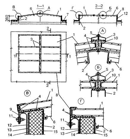 3.2.5. Светопропускающие элементы из силикатного стекла и стеклопакетов должны опираться на несущие элементы по периметру (по всем сторонам). 3.2.6. Конструктивное решение зенитных фонарей должно обеспечивать независимость их статической работы от несущих элементов покрытия. Опорные контуры зенитных фонарей в покрытиях из сборных железобетонных элементов следует устанавливать на специальные плиты с проемами (см. серии 1.465.1-15, 1.465.1-20, 1.465.1-21) или на монолитные железобетонные конструкции покрытий, имеющие световые проемы, а в покрытиях из профилированного стального настила - на стальные прогоны. 3.2.7. Опорные контуры зенитных фонарей должны возвышаться над кровлей не менее чем на 300 мм. Угол наклона к горизонту светопропускающего заполнения зенитных фонарей должен составлять не менее 12°. Грани опорных контуров фонарей могут выполняться наклонными. Угол наклона граней к вертикали не должен превышать 30°. Примеры конструктивного решения различных видов фонарей со светопропускающими элементами из стеклопакетов, органического стекла и поликарбоната и узлы их опирания показаны на рис. 3.3 - 3.8. Рис. 3.3. Зенитный фонарь со светопропускающими элементами из стеклопакетов 1 - стеклопакет; 2 - опорный контур; 3 - нащельник; 4 - уплотнительная резиновая прокладка; 5 - болт; 6 - защитная металлическая сетка; 7 - уплотнитель; 8 - прижимной элемент; 9 - упорный элемент; 10 - герметизирующая мастика; 11 - винт; 12 - фартук; 13 - гидроизоляционный ковер; 14 - утеплитель; 15 - пароизоляция