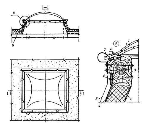 Рис. 3.5. Зенитный фонарь со светопропускающим элементом из органического стекла 1 - двухслойный купол из органического стекла; 2 - опорный контур; 3 - деревянная рама; 4 - утеплитель; 5 - фартук; 6 - прижимная планка; 7 - прижимная кляммера; 8 - уплотнитель; 9 - несущие прогоны