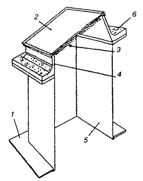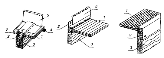 Рис. 3.7. Узлы сопряжения элементов светопропускающего заполнения из сотового поликарбоната: а - плоского; б - ребристого 1 - панель из сотового поликарбоната; 2 - нащельник из: а - алюминия и б - поликарбоната; 3 - торцевая накладка из поликарбоната; 4 - уплотнитель; 5 - стальной несущий профиль; 6 - алюминиевый несущий профиль; 7 - деталь крепления панели Рис. 3.8. Узлы сопряжения панелей из сотового поликарбоната со стеной 1 - панель из сотового поликарбоната; 2 - алюминиевый крепежный профиль; 3 - деревянный ригель; 4 - рейка обрешетки; 5 - фартук 3.2.8. Детали опорного контура и несущего каркаса зенитных фонарей изготавливают из тонколистовой стали по ГОСТ 19903-74 и ГОСТ 19904-90 и холодногнутых стальных профилей по ГОСТ 8278-83*, ГОСТ 8282-83*, ГОСТ 30245-94*. Соединение деталей опорного контура и рамных элементов следует, как правило, выполнять на болтах или самонарезающих винтах. Допускается соединение элементов на сварке. Для изготовления опорных контуров зенитных фонарей могут также применяться листы из стеклопластика и асбестоцемента, профили и листы из алюминиевых сплавов и другие материалы. 3.2.9. Несущие конструкции элементов светопропускающего заполнения (каркас) зенитных фонарей могут выполняться из алюминиевых или стальных профилей. Крепление элементов светопропускающего заполнения (стеклопакетов, панелей из поликарбоната) производится с помощью нащельников, закрепляемых к опорным конструкциям шурупами или самонарезающими винтами. Нащельники выполняют из алюминиевых или холодногнутых стальных профилей. 3.2.10. Опорные контуры должны быть утеплены и защищены от коррозии. Материалы, применяемые для антикоррозийных покрытий, должны соответствовать требованиям СНиП 2.03.11-85. 3.2.11. Для утепления опорных контуров зенитных фонарей следует, как правило, применять плитные эффективные утеплители из негорючих (НГ) или слабогорючих (Г1) материалов с плотностью не более 250 кг/м3. В качестве таких материалов могут применяться жесткие и полужесткие минераловатные плиты по ГОСТ 9573-82, плиты теплоизоляционные из пенопласта по ГОСТ 20916-87, плиты полистирольные типа ПСБ-С с антипиреном по ГОСТ 15588-86. 3.2.12. Наклейку плит утеплителя на стенки опорного контура рекомендуется производить на горячей битумной мастике теплостойкостью до 100 °С по ГОСТ 2889-80. 3.2.13. Для уплотнения и герметизации стыков элементов светопропускающего заполнения фонарей между собой и стыков между этими элементами и опорным контуром должны применяться полимерные профилированные и плоские пористые прокладки (ГОСТ 19177-81, ГОСТ 25621-83, ГОСТ 30778-2001), а для их герметизации - силиконовые или тиоколовые герметики, нетвердеющие самоклеющиеся ленты и другие подобные материалы по соответствующей нормативной документации. 3.2.14. Фартуки зенитных фонарей следует изготавливать из стального оцинкованного листа толщиной 0,5 - 0,7 мм по ГОСТ 14918-80. 3.2.15. Уплотнение стыков между элементами светопропускающего заполнения следует выполнять вспененным полимерным материалом. 3.2.16. Уплотнители, прокладки, герметики и другие полимерные материалы, применяемые в конструкциях зенитных фонарей, должны быть защищены от прямого солнечного облучения нащельниками или фартуками. 3.2.17. Полимерные материалы, используемые для изготовления фонарей, должны иметь разрешение на их применение от органов Государственного санитарного надзора. 3.