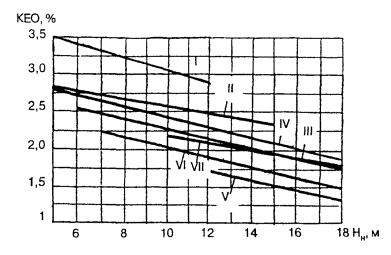 3.7.11. Расположение световых проемов в покрытии здания определяется характером размещения рабочих мест в помещении. При поточном или конвейерном технологическом процессе фонари следует располагать над технологическими линиями. В случаях, когда не предъявляются специальные требования к естественному освещению рабочих мест, фонари рекомендуется размещать равномерно по площади покрытия. Неравномерность естественного освещения по площади помещений производственных и общественных зданий не должна превышать 3 : 1. Неравномерность естественного освещения не нормируется для вспомогательных помещений производственных зданий и помещений общественных зданий с разрядами зрительной работы Г, Д, Е, Ж, З. 3.7.12. Степень неравномерности естественного освещения по площади помещения находят по значениям КЕО в расчетных точках, расположенных на пересечении вертикальной плоскости разрезов помещения с наименьшей и наибольшей освещенностью и условной рабочей поверхности или пола. Определение КЕО в расчетных точках помещения следует производить по методу, изложенному в приложении 9 настоящих Рекомендаций. 3.7.13. Зенитные фонари не должны располагаться в местах перепада высот зданий. Расстояние от фонарей до места перепада высот должно составлять не менее 6 м. Расстояние от зенитных фонарей до парапетов и вентиляционных камер должно составлять не менее 3 м. 3.7.14. Среднее значение КЕО в помещениях, освещаемых светоаэрационными фонарями с однослойным остеклением, может определяться с помощью графиков, приведенных на рис. 3.12. При заполнении световых проемов однокамерными стеклопакетами значения КЕО на рис. 3.12 должны быть уменьшены на 12 - 15 %, а при заполнении панелями из поликарбоната толщиной 10 - 16 мм - на 15 - 20 %. На рис. 3.12 приведены значения КЕО для помещений высотой от условной рабочей поверхности (у.р.п.) до низа светоаэрационного фонаря до 18 м и длиной - 60 м и более. При меньшей длине фонаря и большей высоте до низа фонаря принимаемые по графикам значения КЕО должны умножаться на коэффициент K1 приведенный в табл. 3.9. Рис. 3.12. Графики для определения средних значении КЕО на у.р.п. в помещениях, освещаемых прямоугольными светоаэрационными фонарями I - фонарь одноярусный высотой 1,8 м, шириной 6 м, помещение пролетом 18 м II - » » » » » 12 м » » 24 м III - » » » » » 12 м » » 30 м IV - » » » » » 12 м » » 36 м V - » » » » » 12 м » » 42 м VI - двухъярусный фонарь высотой 2×1,25 м » 12 м » » 36 м VII - » » » » » 12 м » » 42 м Таблица 3.9