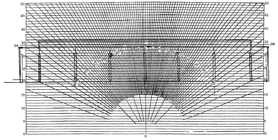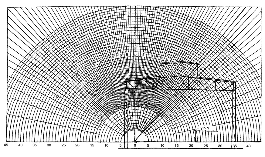 Накладываем график II приложения 9 на чертеж продольного разреза помещения таким образом, чтобы его вертикальная ось и горизонталь 34 проходила через середину светопроема.