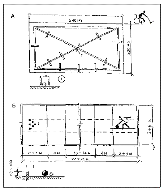 А. Площадка для игры в крокет. Б. Площадка для игры в кегли · Футбол-теннис - игра для инвалидов с ПОДА. Играют 2 команды по 4 игрока. Разрешен переброс мяча любой частью тела, кроме рук. Прямоугольное поле для игры 20´8 м разделено на две половины сеткой высотой 1 м от пола. · Мяч через шнур - игра, близкая по правилам к волейболу. Играют инвалиды с ПОДА (ампутанты): 2 команды по 4 игрока. По правилам не допускается падение мяча. Размеры поля для игры - 5´8 м, шнур натягивается посередине на высоте 1,8 м от пола. · Гандбол через сетку - игра для инвалидов с ПОДА (ампутанты). Играют 2 команды по 6 - 10 чел. Поле для игры 30´10 м, сетка или шнур натягиваются на высоте 1,8 - 2 м от пола. «Воротами» считается вся зона в торцах площадки, верхней границей - шнур на высоте 2,4 м от пола.