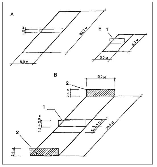 А. Футбол-теннис. Б. Мяч через шнур. В. Гандбол через сетку. Схемы площадок для игры: 1 - сетка (шнур); 2 - зона ворот · Мини-гольф - упрощенный гольф с расположением лунок по кругу. Играющие должны ударом клюшки попасть мячом в цель (лунку). Покрытие площадки - травяное. · Метание кольца - игра заключается в метании кольца в цель, расположенную на горизонтальной, вертикальной или наклонной поверхности. Размеры зоны для метания - 15´3 м. Покрытие - грунтовое, из спецсмесей, резинобитумное.
