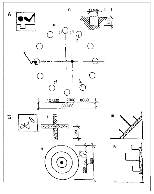 А. Площадка для игры в мини-гольф: а - план, б - разрез по лунке. Б. Устройства для игры в метание колец: I, II - план, III, IV - разрезы Детские физкультурно-игровые сооруженияПЛОЩАДКИ ДЛЯ СПОРТИВНЫХ ИГР · В течение последних лет инвалиды сами стали инициаторами ряда игр: флюгбол («летающий мяч»), прельбол («мяч с отскоком»), зицбол («мяч сидя»), волейбол сидя, фаустбол в зале, баскетбол на инвалидной коляске, саксессбол, юниор-саксессбол (упрощенный баскетбол). Размеры площадок для начинающих игроков даны в табл. 1. Таблица 1