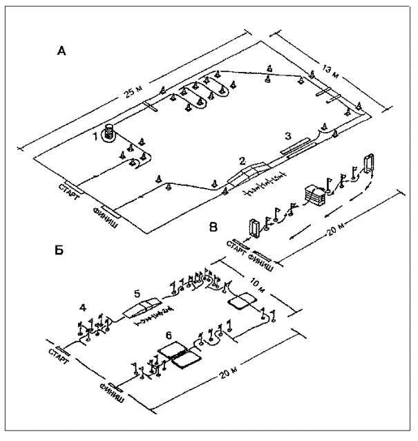 А. Мини-волейбол Дети 6 - 8 лет: а = 10 м, l = 6 м, высота сетки 180 см; Дети 9 - 12 лет: а = 12 м, l = 9 м, высота сетки 200 см. Б. Ринго Можно проводить на волейбольной площадке: а = 12 м, l = 6 м, высота сетки 200 см; а = 18 м, l = 9 м, высота сетки 243 см; игровой снаряд - резиновое кольцо. В. Мини-теннис а = 12 м, l = 6 м, высота сетки 80 см. Г. Футбольный теннис Можно проводить на волейбольной площадке: а = 10 м, l = 6 м; а = 12 м, l = 9 м; а = 18 м, l = 9 м; высота сетки 110 см. Д. Крокет а = 12 м, l = 5 м ПОЛОСЫ ПРЕПЯТСТВИЙ · Для развития координации движений и ориентации в пространстве используют полосы препятствий. · Для детей, способных передвигаться на ногах с опорой, возможны также занятия бегом или ходьбой на укороченные дистанции (от 20 до 500 м в зависимости от физических возможностей детей). · Езда на колясках является основой многих видов спортивных занятий инвалидов. Наиболее распространены: гонка на время и гонка слалом с препятствиями. В зависимости от возраста и степени инвалидности проводятся гонки на время на короткие (30 - 100 м) и длинные (600 - 1000 м) дистанции, а также эстафеты 4´40; 4´60; 4´100 м. Гонка слалом на дистанции 25, 50, 75 м проводится на открытой площадке и в зале. Минимальная площадка 13´25 м, предпочтительнее 15´27 м. Для дистанции 25 м достаточна площадка 7´16,5 м.