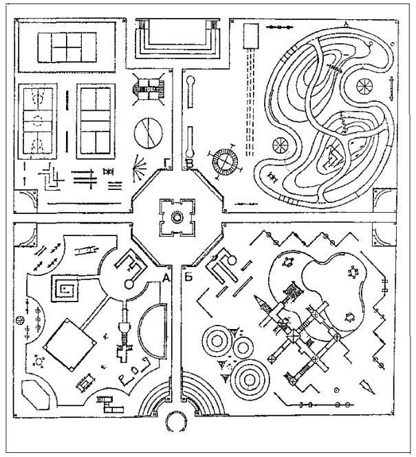 Зона А. Площадка для детей от 2 до 4 - 5 лет. Зона Б. То же, от 5 до 10 лет. Зона В. Участок для подвижных игр детей от 8 до 14 лет. Зона Г. Участок для спортивных игр детей всех возрастов