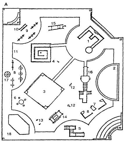 Зона А. Площадка для детей от 2 до 4 - 5 лет: 1 - фонтанчик с отводными коробами; 2 - песочница со скамьями по периметру; 3 - теневой навес; 4 - горка-лабиринт; 5 - горка-манеж с пологой лестницей; 6 - столики-барьеры; 7 - деревянная стилизованная «лошадь»; 8 - качели; 9 - качалки; 10 - бревна для упражнений на равновесие; 11 - стенки для рисования; 12 - корзина для забрасывания мяча; 13 - шест для набрасывания колец; 14 - паровоз; 15 - двойная горка; 16 - «рыба-кит» - горка для скатывания; рукоход; наклонные лестницы; 17 - карусель; 18 - площадка для игры в крокет