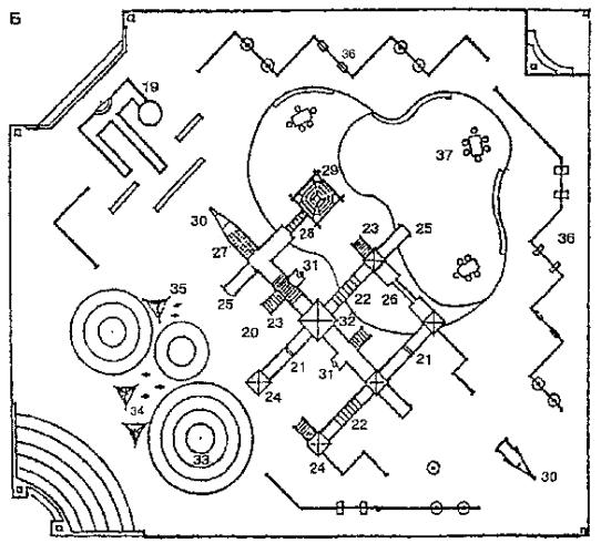 Зона Б. Площадка для детей от 5 до 10 лет: 19 - фонтанчик с отводными коробами; 20 - городок для активной двигательной деятельности; 21 - висячий мостик; 22 - туннель для проползания; 23 - наклонная лестница; 24 - вертикальная лестница; 25 - горка для скатывания; 26 - бревно-балансир; 27 - горизонтальный рукоход из канатов; 28 - веревочная горизонтальная лестница; 29 - система канатных сеток для лазания; 30 - канаты; 31 - шест для лазания; 32 - площадка с теневыми зонтами; 33 - искусственный рельеф - насыпные холмы; 34 - шесты - деревья; 35 - теневые зонты-шалаши; 36 - стенка, состоящая из: досок для рисования, целей для метания, качелей из автопокрышек, колец, трапеций, лестниц веревочных и деревянных; 37 - песочница