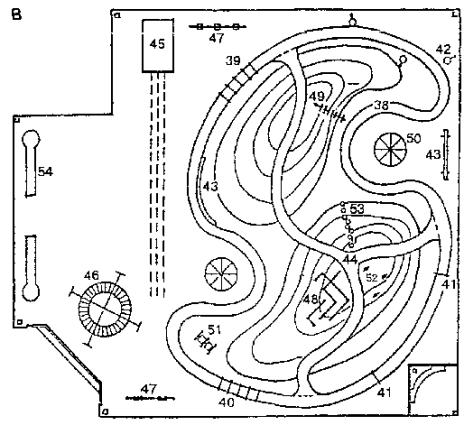 Зона В. Участок для подвижных игр детей от 8 до 14 лет: 38 - дорожка для бега; 39 - воротца для подлезания; 40 - барьеры; 41 - воротца с кольцом; 42 - шест с кольцом; 43 - бревно-балансир; 44 - дорожки для бега по пересеченной местности; 45 - яма для прыжков в длину; 46 - рукоход круговой; 47 - качели; 48 - вертикальные лестницы; 49 - наклонный шест; 50 - карусели; 51 - барабаны-бегунки; 52 - шесты - деревья; 53 - дорожка из бревен; 54 - переносные дорожки для мини-гольфа