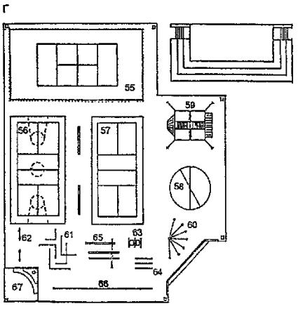 Зона Г. Участок для спортивных игр детей всех возрастов: 55 - площадка для игры в малый теннис; 56, 57 - площадка для игры в бадминтон с разметкой для баскетбола; 58 - площадка для игры в спиралебол; 59 - пространственный гимнастический комплекс; 60 - разновысокие перекладины; 61 - брусья-лабиринт; 62 - штанги; 63 - барабаны-бегунки; 64 - параллельные и разновысокие брусья; 65 - бревна-балансиры; 66 - гимнастическая стенка; 67 - подсобные помещения с санузлами · Игровые открытые площадки имеют наибольшее распространение среди сооружений для детей, так как длительное пребывание на воздухе - одно из требований режима дня ребенка. · Комплексные игровые площадки для активного досуга компонуются в основном из следующих зон: физкультурно-игровых устройств; игр с водой и с песком; спортивных игр. Комплекс может быть дополнен зонами: для изучения правил дорожного движения; уголками природы с различными растениями и вольерами для животных; тематическими («театр», «цирк», строительные конструкторы, сооружения, имитирующие жилье разных исторических эпох: замки, вигвамы, пещеры и т.п.), но этот набор требует обязательного присутствия инструктора и кладовых для хранения инвентаря. · Территория участка для игр рассчитывается исходя из минимальной площади, необходимой для одного ребенка: 1 - 4 лет - 5 - 7 м2; 5 - 7 лет - 7 - 10 м2; 8 - 10 лет - 10 - 12 м2.