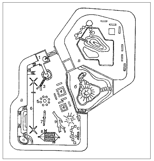А, Б. Площадки для гонки слалом размерами 25´13 и 20´10 м. В. Полоса препятствий для двигающихся без коляски: 1 - тумба (диаметр 0,8, высота 1 м); 2 - пандус (высота 0,3, ширина 1 м); 3 - доски (длина 1,5 м, ширина 0,1, толщина 0,05 м); 4 - флажки для объезжания; 5 - пандус (высота 0,3, ширина 4 м); 6 - маты КОМПЛЕКСНЫЕ ИГРОВЫЕ ПЛОЩАДКИ · Травмобезопасность детей должна обеспечиваться устройством оград высотой 1 - 1,2 м из металлических сеток, дерева или живой изгороди в местах примыкания площадок к улицам, железным дорогам, глубоким водоемам; организацией дренажа поверхности площадок; правильным выбором покрытий для разных видов деятельности. · Игровые площадки желательно визуально обособлять от неигрового пространства (городской среды, жилых корпусов, спортивных площадок для взрослых). · Необходимо разграничивать площадь участка на зоны по возрастным категориям, выделять места для детей от 1 года до 4 лет. Площадки для детей старшего дошкольного и младшего школьного возраста можно условно разделить с помощью усложняемых игровых устройств на зоны для 5 - 7, 8 - 10; 11 - 12 лет.
