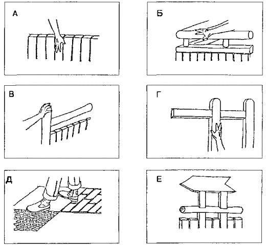 Площадка с зоной водных игр (проект) (ФРГ) а - зона физкультурно-игровых устройств, суммарная площадь песочниц 60 - 100 м2; б - зона игр с глинистым песком для лепки, площадь ямы с песком 40 - 60 м2; в - зона с плескательным бассейном, глубина воды 0 - 50 см, площадь поверхности воды 40 - 100 м2: 1 - деревянная башня; 2 - яма с песком, 3 - канатный мост; 4 - песочница; 5 - сидячие места для игр; 6 - канатная подвесная дорога; 7 - качалка; 8 - канатные сетки для лазания; 9 - дерево для лазания; 10 - катофон; 11 - песочный холм · Основные требования к организации площадок для слепых и ограниченно зрячих (ОЗ): А - игровое пространство необходимо ограничивать загородкой высотой 600 - 900 мм; Б - пешеходные и беговые дорожки должны быть снабжены направляющими поручнями; В - выступы на поручне обозначают конец дорожки; Г - перепады рельефа отмечаются повышением или понижением направляющего поручня; Д - повороты дорожек обозначаются изменением качества и фактуры покрытия: твердое - мягкое, гладкое - неровное, с выпуклыми или вогнутыми плитами; Е - на пешеходных дорожках устанавливается указатель направления движения к площадке со стационарным игровым оборудованием.