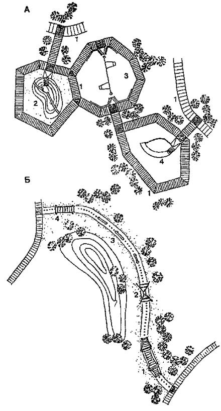 А. Фрагменты дорожек (например, «тропы здоровья»), оборудованные системой информации для незрячих: 1 - поворот; 2 - прямая; 3 - барьер, ограждение; 4 - легкое ограждение (веревка); 5 - развилка или перекресток. Б. Устройство игровых площадок: 1 - площадка; 2 - полоса ориентации; 3 - зона безопасности; 4 - зеленые насаждения; 5 - трибуны ПЛОЩАДКИ И ДОРОЖКИ ДЛЯ РАЗЛИЧНЫХ ЗАНЯТИЙ · Важным элементом открытых физкультурно-оздоровительных сооружений является «тропа здоровья». Ее протяженность и степень сложности для прохождения определяются в соответствии с конкретными условиями. «Тропа здоровья» может оснащаться как стандартными видами оборудования, так и специальными, рассчитанными на инвалидов определенных категорий. Маршрут и зоны для упражнений должны обозначаться при помощи системы информации для незрячих, а также четкими, хорошо различимыми указателями.