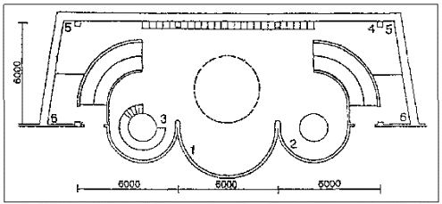 Оздоровительно-игровой комплекс «Союзкурортпроект»: 1 - игровая для младших школьников; 2 - игровая для дошкольников; 3 - зал с ванной для обучения плаванию; 4 - комната инструктора; 5 -раздевальные; 6 - кладовые · Для детей-инвалидов младшего дошкольного возраста и при тяжелых формах инвалидности рекомендуются многофункциональные помещения, обеспечивающие организацию игр, в которые более подвижные и приспособленные дети могут играть на открытых площадках. Полы и стены в этих помещениях устраиваются так, что ребенок может передвигаться ползком или держась за опорные поручни и мебель. Примером такого помещения может служить «Домик для игр в воде и с песком» (площадь комнаты с песком и ванной для плескания 12 м2); комната со свободной площадью для передвижения 15 м2; кладовая, проекторная 4 м2.
