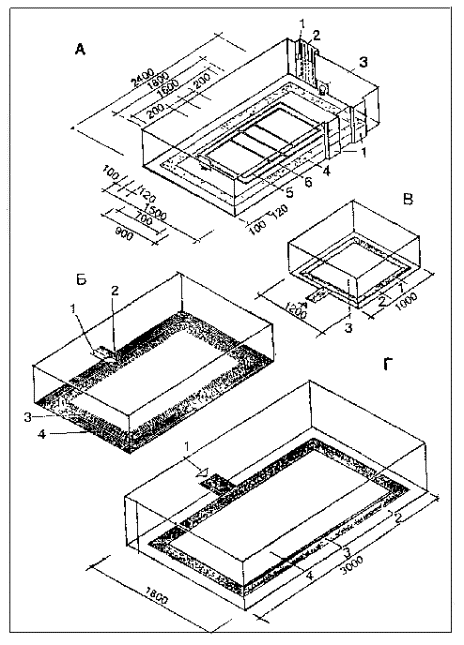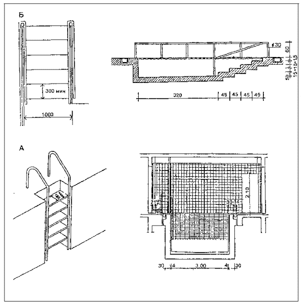 А, Б. Бассейны без волнообразования. В. Учебный бассейн, где турбулентные движения слабы при работе волновой машины. Г. Необходимо устройство выступа для отделения обходной дорожки (1) от сухой общественной зоны (2). Выступ задерживает воду (3) при работе волновой машины. Д. Фрагменты бортов ванн: 1 - пандус; 2 - обходная дорожка; 3 - камера волнообразующей машины; 4 - высота борта (зависит от волн); 5 - нормальный уровень воды ДЕТАЛИ И ЭЛЕМЕНТЫ ДЕТСКИХ ВАНН · Для детей слепых и ограниченно зрячих необходима тактильная и цветовая разметка пола для ориентации в помещении. · Спуски в воду устраиваются разных видов: А - пологая лестница в мелкой части ванны, углубленная в нишу; Б - вертикальная лестница с поручнями, уходящими в воду. Дети с тяжелыми формами инвалидности нуждаются в устройстве таких же типов подъемников, как и в бассейнах для взрослых.