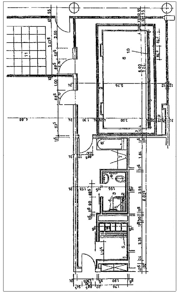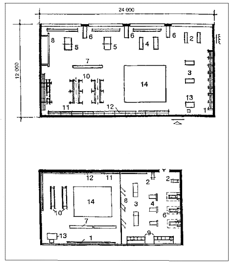 А. Оборудование к залу размером 9´15 м для тренажеров: 1 - тренажер для развития мышц; 2 - тренажер «Горка»; 3- приспособление «Скамья универсальная»; 4 - тренажер для бега; 5 - велотренажер «Здоровье»; 6 - стойки для приседания со штангой; 7 - скамья для жима лежа; 8 - стеллаж для гантелей; 9 - стеллаж для штанг; 10 - тренажер «Стенка»; 11 - тренажер для развития мышц; 12 - тренажер для плечевого пояса; 13 - тренажер для мышц спины. Б. Информационная полоса Бассейны для физкультурно-оздоровительных занятийОСНОВНЫЕ ТРЕБОВАНИЯ · По периметру ванн бассейнов следует предусматривать обходную дорожку шириной не менее: для открытых бассейнов - 2,5 м, для бассейнов в залах - 2 м. Ширина дорожки со стороны стартовых тумбочек и выходов из раздевальных помещений должна быть не менее 3,5 м. · Вдоль стен зала бассейна и на входах в зал из помещений для переодевания и душевых следует устанавливать горизонтальные поручни на высоте от пола в пределах от 0,9 до 1,2 м, а в залах с бассейном для детей - на уровне 0,5 м от пола. · По внешнему периметру обходных дорожек вокруг открытых бассейнов следует предусматривать ограждения высотой не менее 1 м с поручнями. · В мелкой части ванны бассейна для спуска в воду следует устраивать лестницу шириной не менее 0,9 м, с шириной проступей не менее 0,3 м и высотой подступенков не более 0,14 м. Лестница должна иметь стационарные поручни. · Для спуска в воду и подъема из нее инвалидов с поражениями опорно-двигательного аппарата следует использовать желоба или специальные подъемники. · В бассейнах, предназначенных для инвалидов, не рекомендуется устраивать ножные проходные души на выходах из раздевальных. Вместо этого желательно предусмотреть коврик, пропитанный антисептическим составом. В местах, где ножные проходные души уже оборудованы (при реконструкции существующих сооружений), возможно устройство их объезда. · На обходных дорожках рекомендуется устанавливать стационарные скамьи с подогревом для отдыха занимающихся. · В любом случае, устанавливаемое на обходных дорожках оборудование не должно уменьшать минимально рекомендуемой ширины прохода. ТЕРАПЕВТИЧЕСКИЕ ВАННЫ · В ваннах терапевтического и двигательно-оздоровительного назначения по периметру устраивается борт высотой 0,65 м. С одной длинной стороны ванны уровень обходной дорожки понижен на 0,15 м для работы врача или инструктора. Вне габаритов ванны следует предусматривать пологую лестницу для спуска в воду. · Терапевтические ванны следует оборудовать двигающимися по укрепленному на стенах (потолке) монорельсу подвесными вспомогательными средствами.