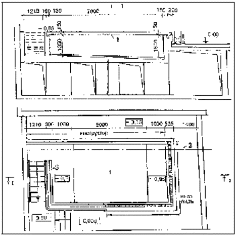 Вариант решения ванны для терапевтических занятий: 1 - отметка зеркала воды +0,5 м; 2 - место расположения монорельса тельфера; 3 - поручень ДЕТСКИЕ ВАННЫ · В состав оздоровительного бассейна для детей рекомендуется включать дополнительные ванны для адаптации детей к воде и игровой зал подготовительных занятий.
