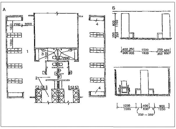 Планировочные решения раздевальных А. План. Б. Варианты размещения шкафов для переодевания в помещении: 1 - места для переодевания; 2 - обычный санузел и душевые; 3 - кабина для переодевания с душевой и санузлом; 4 - уширенная скамья для переодевания; размеры над чертой - для детей, под чертой - для взрослых · В раздевальнях для детей-инвалидов желательно предусматривать отдельно стоящую скамью (шириной 600 - 900 мм, длиной до 2500 мм) или место для поролоновых матов для переодевания лежа в полный рост. · Во всех досуговых сооружениях удобным типом раздевален являются кабины для переодевания, в которых вместе с ребенком может находиться помощник любого пола. Такие раздевальни получили название «семейных». В специальных учреждениях для детей-инвалидов тип раздевальни при залах для физкультурно-оздоровительных занятий и открытых площадках определяется количеством обслуживаемых детей, видом и степенью инвалидности.