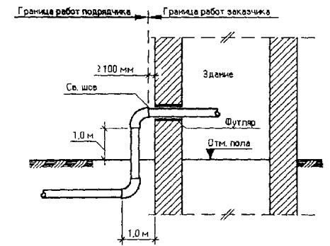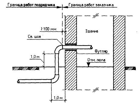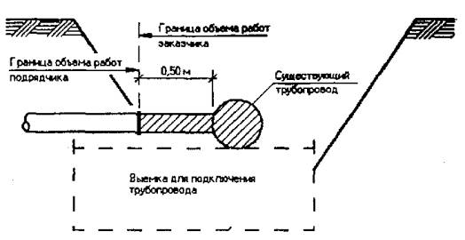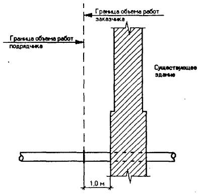 Рис. 2. Границы выполнения работ по привязке и присоединению на существующих зданиях и сооружениях зданий трансформаторной подстанции, трансформаторных станций, телефонных станций, очистных сооружений, водонасосных станций, канализационных насосных станций. Примечание. Подрядчик должен предусмотреть поставку всех материалов, необходимых для присоединения к существующим сетям.